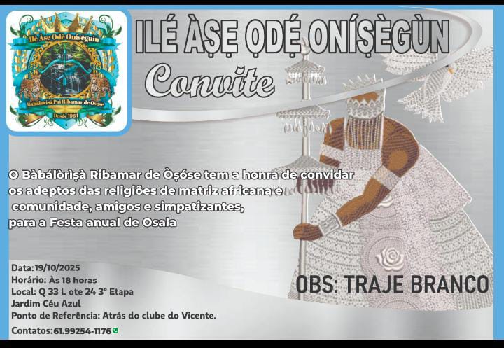 No próximo domingo, 19 de outubro, Valparaíso de Goiás será palco de um dos mais importantes encontros de valorização das religiões de matriz africana na região. O Ilé Àṣẹ Odé Òníṣègùn, sob a liderança do Bàbálòrìṣà Ribamar de Òṣóse, realizará a tradicional Festa Anual de Òsàlá, que promete reunir adeptos, simpatizantes, amigos e toda a comunidade local em um momento de fé, espiritualidade e celebração da cultura ancestral.