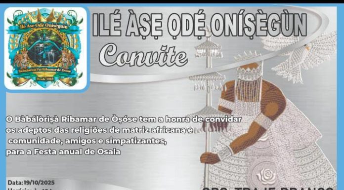 No próximo domingo, 19 de outubro, Valparaíso de Goiás será palco de um dos mais importantes encontros de valorização das religiões de matriz africana na região. O Ilé Àṣẹ Odé Òníṣègùn, sob a liderança do Bàbálòrìṣà Ribamar de Òṣóse, realizará a tradicional Festa Anual de Òsàlá, que promete reunir adeptos, simpatizantes, amigos e toda a comunidade local em um...