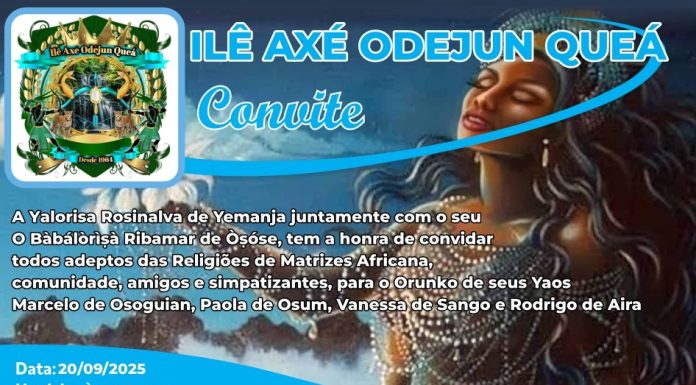 O Ilê Axé Odejun Queá, em Pirapora (MG), será palco de um momento especial neste dia 20 de setembro de 2025. Liderado pelo Babalorixá Ribamar de Ọ̀ṣọ́sẹ̀ e pela Yalorixá Rosinalva de Yemanjá, o terreiro abre suas portas para celebrar o Orunko dos Yaos Marcelo de Osoguian, Paolla de Osum, Vanessa de Sango e Rodrigo de Aira.