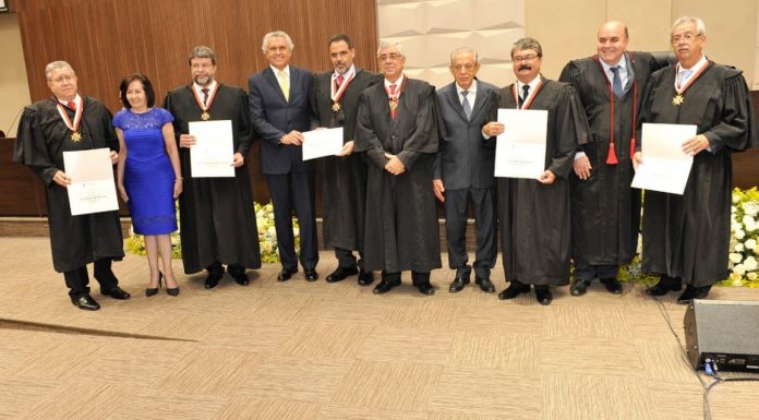 O presidente do TJGO, desembargador Gilberto Marques Filho, convidou o governador Ronaldo Caiado para, ao seu lado, dar posse aos novos desembargadores do Tribunal de Justiça de Goiás (TJGO). A solenidade foi realizada na tarde desta segunda-feira, dia 21, no Plenário da Corte Especial do Tribunal de Justiça, em Goiânia.